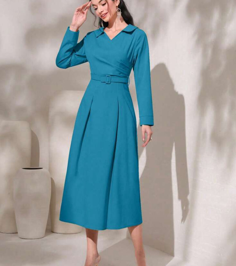 Solid Fold Pleated Detail Belted Dress