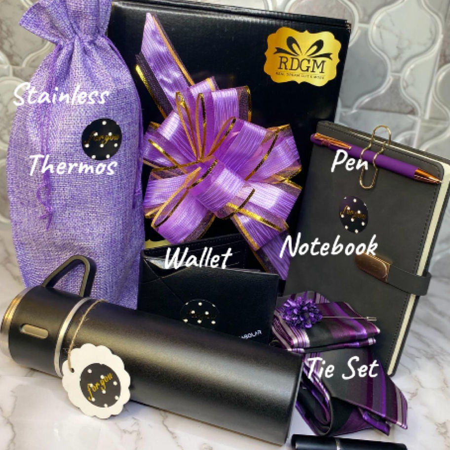 This men's gift box exudes sophistication, featuring a sleek black stainless steel thermos for beverages on the go, a refined black wallet, a stylish black notebook with a matching pen, and a pop of vibrance with a red tie set, tie gorge, and keychain.